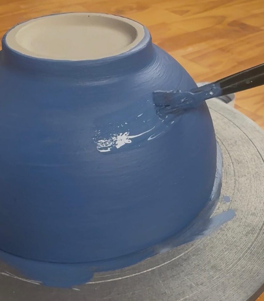 aplicando engobe Rahué Azul Cobalto sobre pieza en estado de cuero