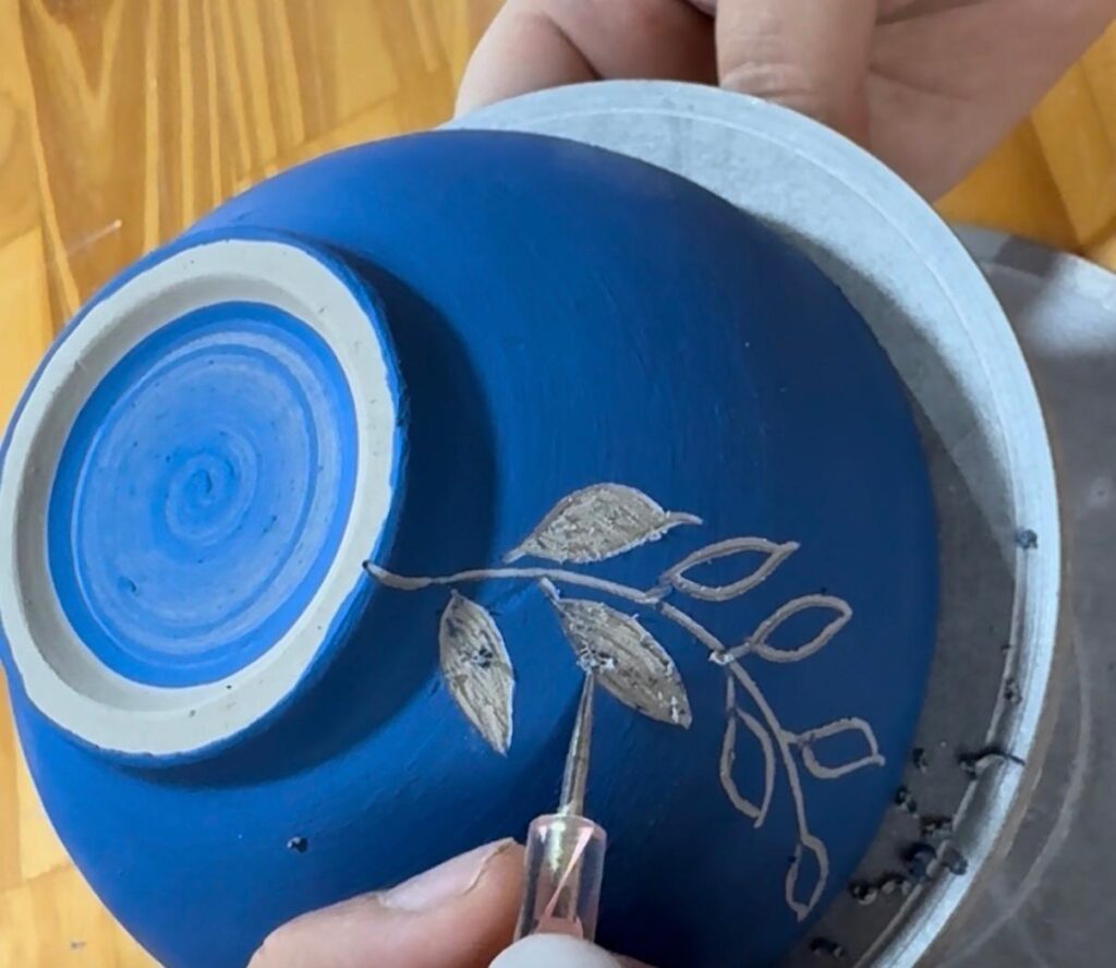Con una herramienta fina (punzón, esteca, aguja o la que uses habitualmente), comenzás a raspar suavemente el engobe hasta que aparece el color de la pasta.